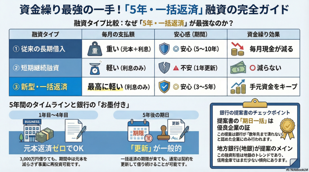 今回登場した「5年一括返済」の融資は、この両者のメリットを融合させたものです。
