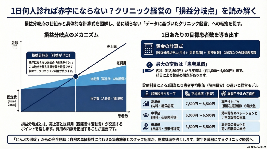 【 損益分岐点売上高(月額) ÷ 1回当たり患者単価 ÷ 診療日数(月間) 】