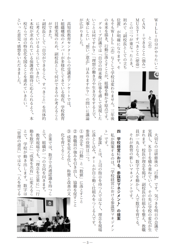 新任副校長研修では、 副校長を「校長の右腕=経営参謀」と